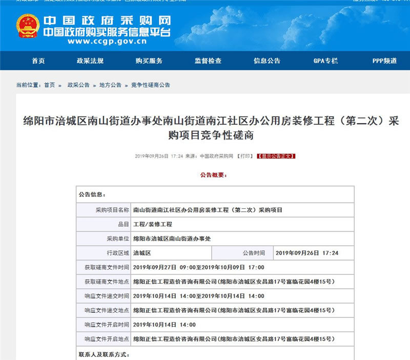 【綿陽正信·招標(biāo)部消息】我公司受綿陽市涪城區(qū)南山街道辦事處委托,對南山街道南江社區(qū)辦公用房裝修工程(第二次)采購項目掛網(wǎng)采購,該項目于2019年09月26日在中國政府采購網(wǎng)掛網(wǎng)公示,預(yù)計于2019年10月14日14:00在綿陽正信工程造價咨詢有限公司開標(biāo)室開標(biāo)。