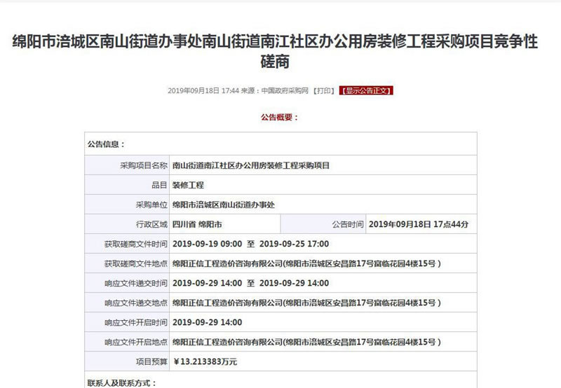 【綿陽正信·招標部消息】我公司受綿陽市涪城區(qū)南山街道辦事處委托,對南山街道南江社區(qū)辦公用房裝修工程采購項目掛網采購,該項目于2019年09月18日在中國政府采購網公示,預計于2019年09月29日14:00在綿陽正信工程造價咨詢有限公司開標室開標。