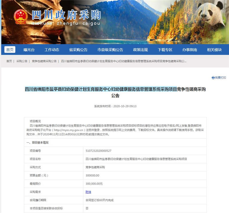 【綿陽(yáng)正信·招標(biāo)部消息】我公司受四川省綿陽(yáng)市鹽亭縣婦幼保健計(jì)劃生育服務(wù)中心委托,對(duì)四川省綿陽(yáng)市鹽亭縣婦幼保健計(jì)劃生育服務(wù)中心婦幼健康服務(wù)信息管理系統(tǒng)采購(gòu)項(xiàng)目擬采用競(jìng)爭(zhēng)性磋商方式進(jìn)行采購(gòu),本項(xiàng)目于2020年10月29日在四川省政府采購(gòu)網(wǎng)、綿陽(yáng)市政府采購(gòu)網(wǎng)公示,預(yù)計(jì)于2020年11月11日14:00在綿陽(yáng)市安昌路17號(hào)富臨花園四樓15號(hào)開標(biāo)。