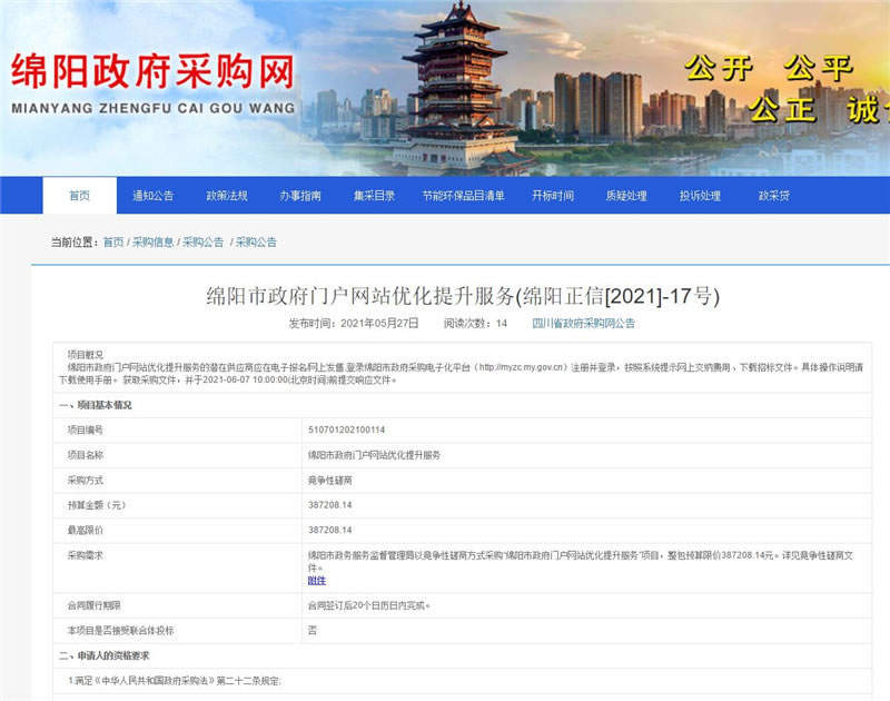 【綿陽(yáng)正信·招標(biāo)部消息】我公司受綿陽(yáng)市政務(wù)服務(wù)監(jiān)督管理局委托,對(duì)綿陽(yáng)市政府門(mén)戶網(wǎng)站優(yōu)化提升服務(wù)擬采用競(jìng)爭(zhēng)性磋商方式進(jìn)行采購(gòu),本項(xiàng)目于2021年05月27日在四川省政府采購(gòu)網(wǎng)及綿陽(yáng)市政府采購(gòu)網(wǎng)公示,預(yù)計(jì)于2021年06月07日10:00在綿陽(yáng)市安昌路17號(hào)富臨花園四樓15號(hào)開(kāi)標(biāo)。
