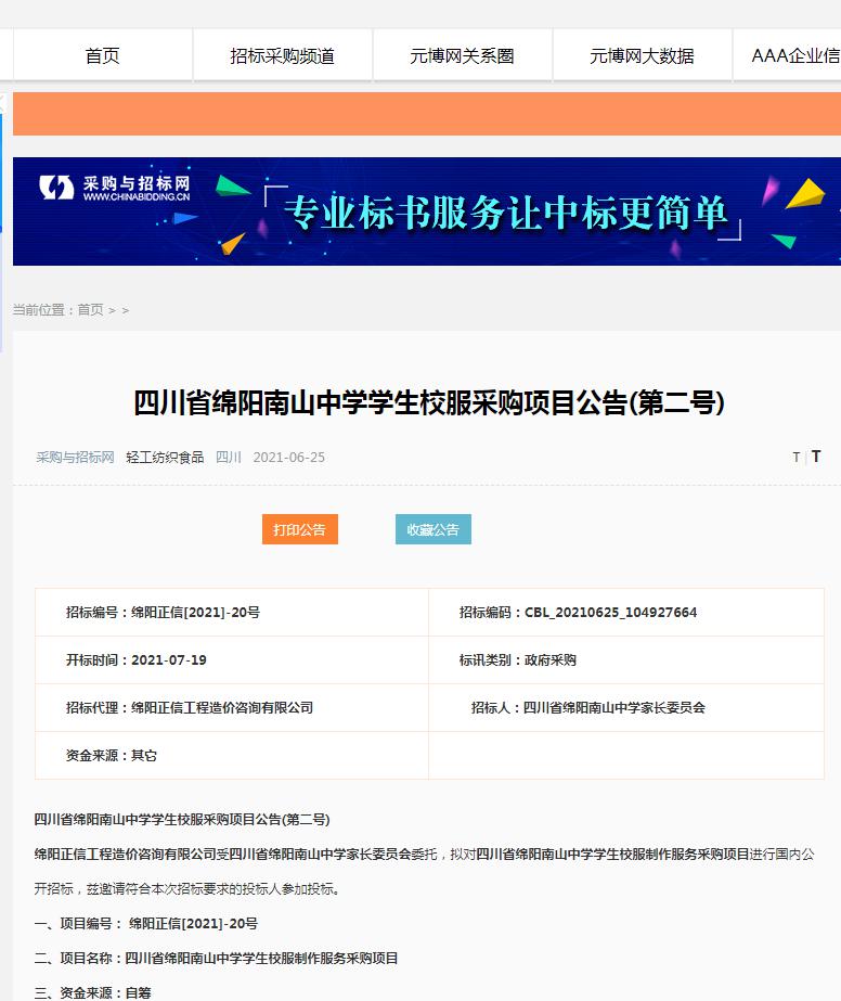 【綿陽(yáng)正信·招標(biāo)部消息】我公司受四川省綿陽(yáng)南山中學(xué)家長(zhǎng)委員會(huì)委托,對(duì)四川省綿陽(yáng)南山中學(xué)學(xué)生校服采購(gòu)項(xiàng)目擬采用公開招標(biāo)方式進(jìn)行采購(gòu),本項(xiàng)目于2021年06月25日在中國(guó)采購(gòu)與招標(biāo)網(wǎng)公示,預(yù)計(jì)于2021年07月19日14:00在綿陽(yáng)科創(chuàng)區(qū)劍南路西段388號(hào)長(zhǎng)興星城3棟2樓11號(hào)開標(biāo)。