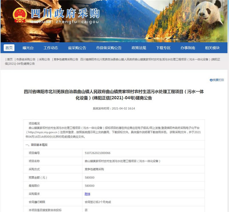 【綿陽正信·招標(biāo)部消息】我公司受北川羌族自治縣曲山鎮(zhèn)人民政府委托,對曲山鎮(zhèn)黃家壩村農(nóng)村生活污水處理工程項目(污水一體化設(shè)備)(第二次)擬采用競爭性磋商方式進行采購,本項目于2021年06月09日在四川省政府采購網(wǎng)及綿陽市政府采購網(wǎng)公示,預(yù)計于2021年06月21日14:00在綿陽市安昌路17號富臨花園四樓15號開標(biāo)。