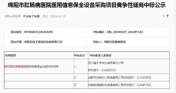 【綿陽正信·招標(biāo)部消息】受綿陽市肛腸病醫(yī)院委托由我公司招標(biāo)代理部代理的“綿陽市肛腸病醫(yī)院醫(yī)用信息保全設(shè)備采購項(xiàng)目”通過在四川省政府采購網(wǎng)掛網(wǎng)招標(biāo),于2019年2月25日在業(yè)主單位、監(jiān)督部門的監(jiān)督下,在綿陽正信工程造價(jià)咨詢有限公司進(jìn)行了項(xiàng)目開評(píng)標(biāo)活動(dòng),并于2019年2月27日完成項(xiàng)目中標(biāo)公示。