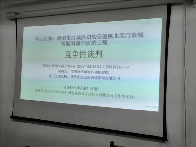 【綿陽(yáng)正信·網(wǎng)絡(luò)消息】2021年3月31日,綿陽(yáng)正信造價(jià)咨詢有限公司政府采購(gòu)部進(jìn)行了“綿陽(yáng)市涪城區(qū)婦幼保健院北區(qū)門診部檢驗(yàn)科流程改造工程”項(xiàng)目的開標(biāo)活動(dòng)。此次開標(biāo)項(xiàng)目的采購(gòu)人:綿陽(yáng)市涪城區(qū)婦幼保健院,采購(gòu)方式:競(jìng)爭(zhēng)性談判。